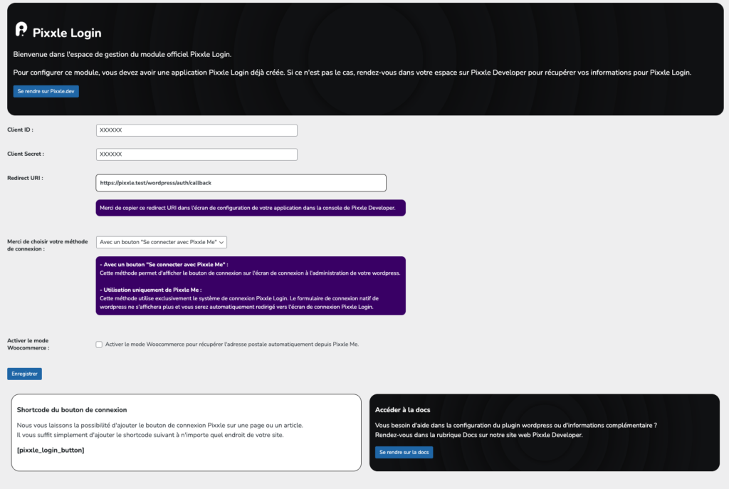 Sur cet écran, vous trouverez des champs à remplir pour connecter le plugin à notre système Pixxle Login.